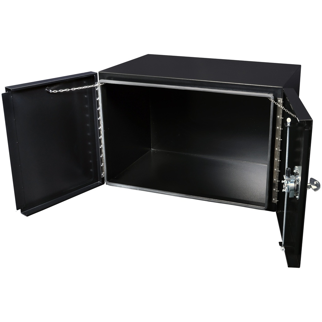 Made of steel and finished with a black coating for extra protection against dirt and external influences. This makes this underbody box for trucks suitable for mounting under the vehicle, where it is exposed to splashing water and road dirt.